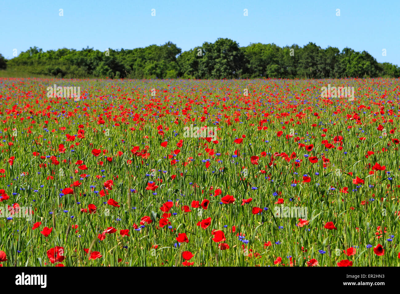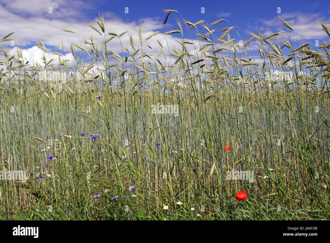 Kornblumen vor einem Getreidefeld mit roten Mohnblumen
