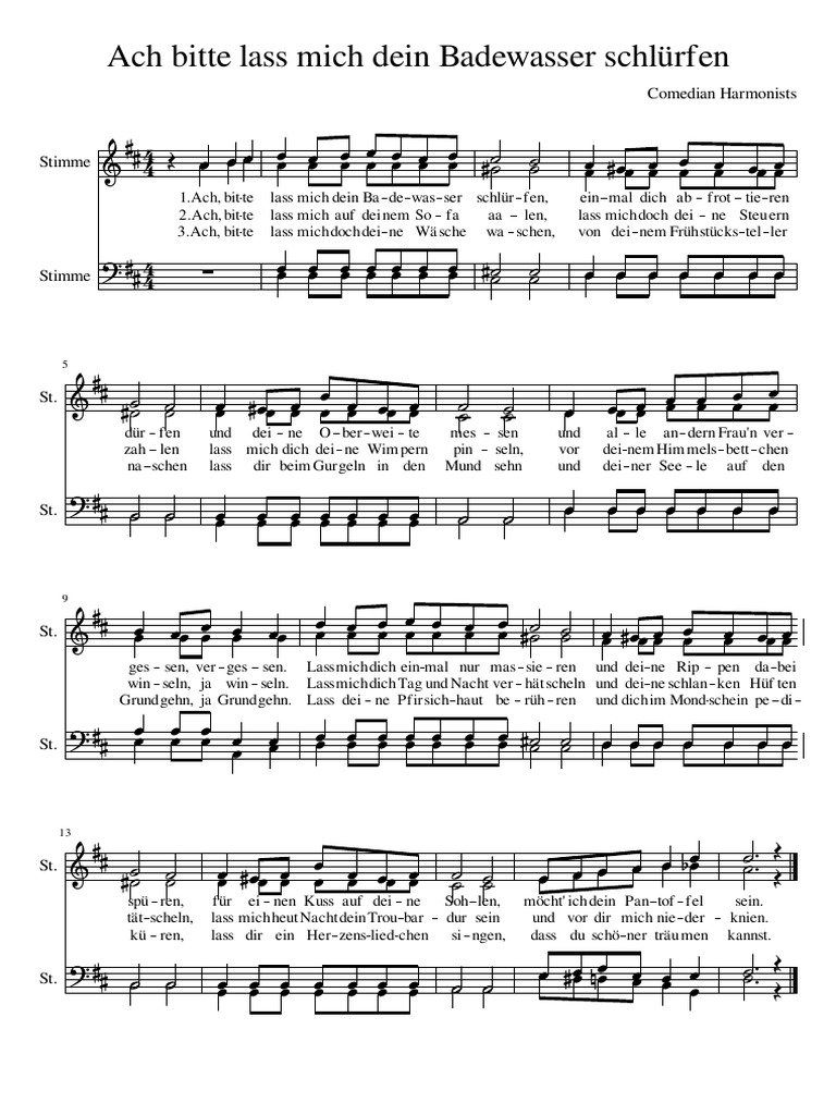 WebLaß mich Dein Badewasser schlürfen (Whispering) Chords - ChordU Chords for Laß mich Dein Badewasser schlürfen (Whispering) 0:00 / 0:00 T ranspose : +0 share favorite. WebLaß mich dein Badewasser schlürfen, einmal dich abfrottieren dürfen, und deine Oberweite messen und alle andern Frau'n vergessen, vergessen, laß mich dich einmal. WebAch Bitte Lass Mich Dein Badewasser Schlürfen. July 2021. PDF. Bookmark. This document was uploaded by user and they confirmed that they have the permission to. Web[C B Gb Ab Bb] Chords for DREIKLANG - Lass mich dein Badewasser schlürfen with Key, BPM, and easy-to-follow letter notes in sheet. Play with guitar, piano, ukulele, or any instrument you choose. WebMix - Die Viel Harmoniker Lass mich Dein Badewasser schlürfen Comedian Harmonists, Compay Segundo, Max Raabe, and more Der Neger hat sein Kind gebissen / Odeon-Tanz-Orchester mit Refraingesang... WebLass mich dein Badewasser schlürfen, man wird doch Wasser sparen dürfen? Lässt du das Shampoo in der Tube, wenn ich dich dafür kräftig schrubbe? Würd`st ohne Seife es.