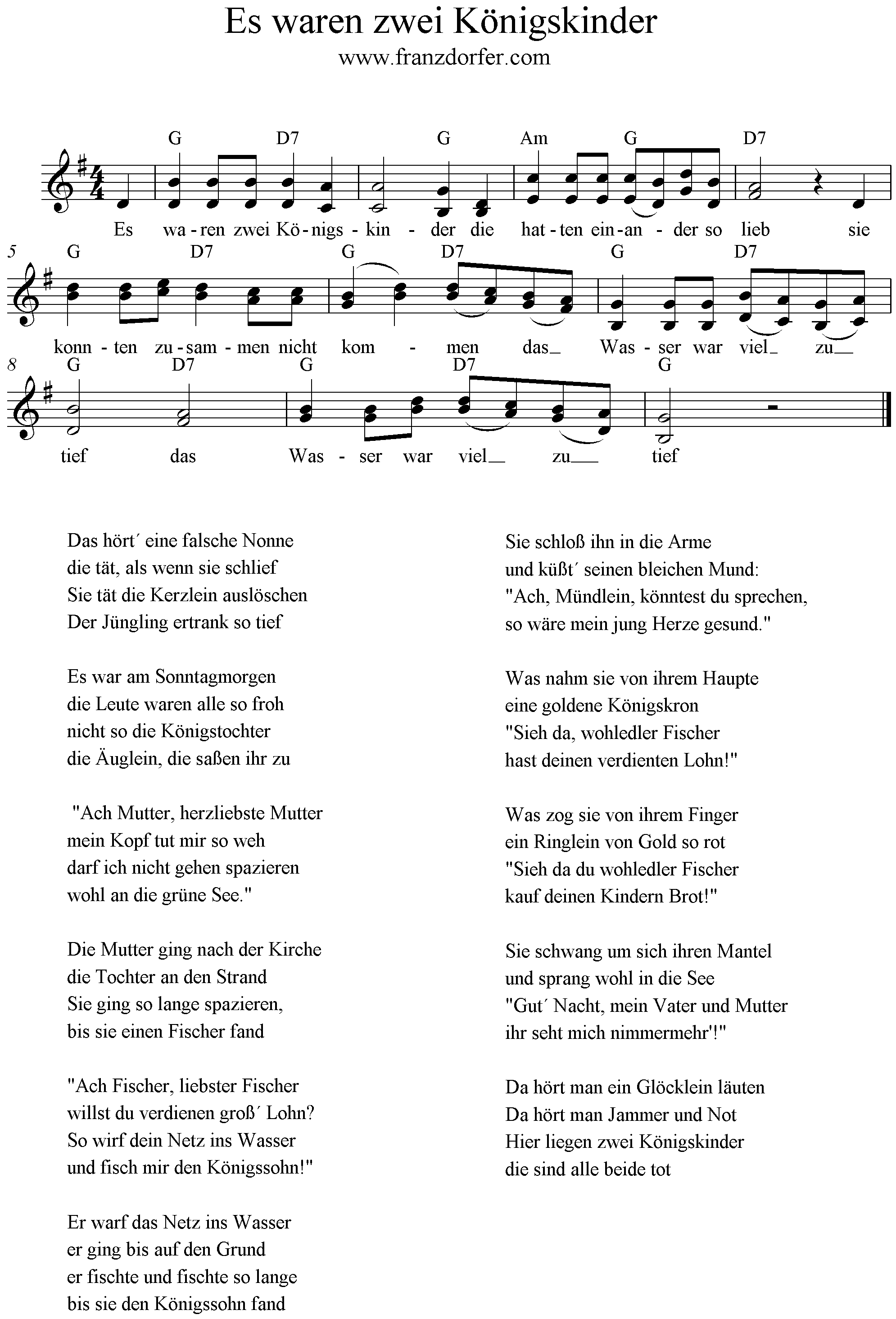 Es waren zwei Königskinder - Noten, Liedtext, MIDI, Akkorde